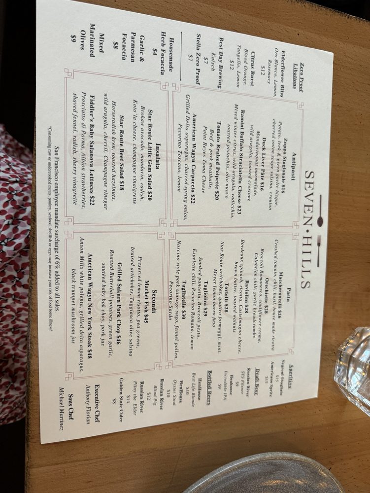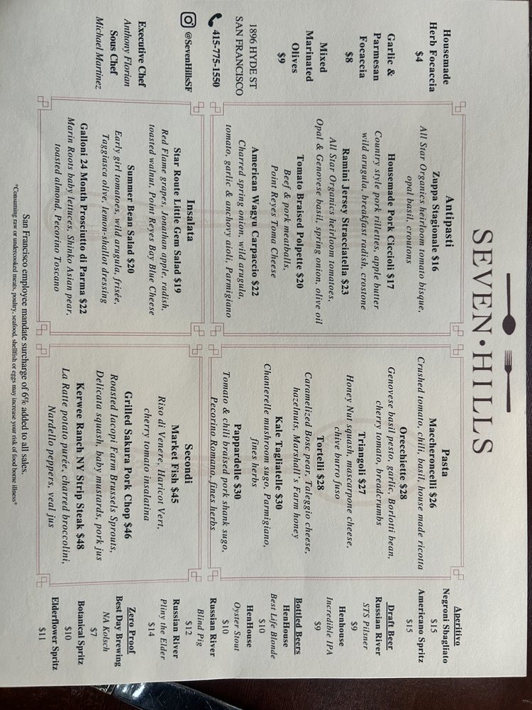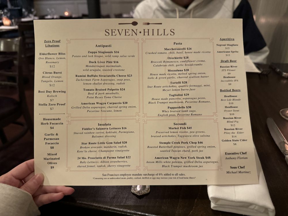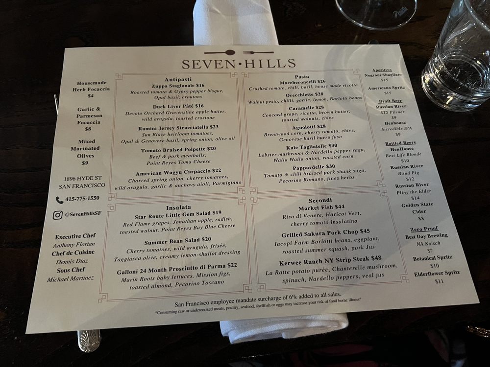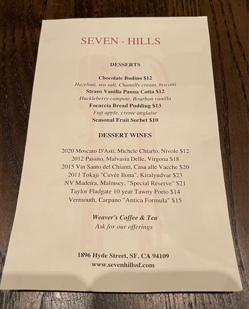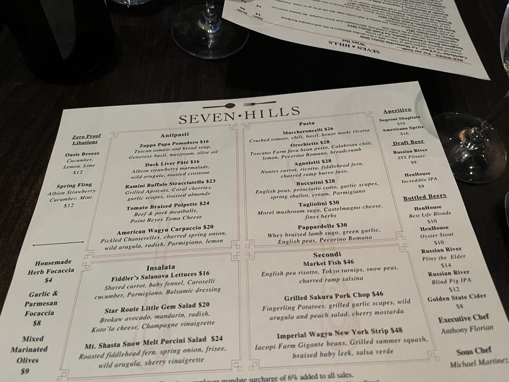 Seven Hills, a gem nestled in San Francisco's Russian Hill neighborhood, offers a sophisticated dining experience in its intimate and classy wine bar setting. The menu, crafted with a farm-to-table approach, showcases authentic Italian cuisine with a modern twist.
